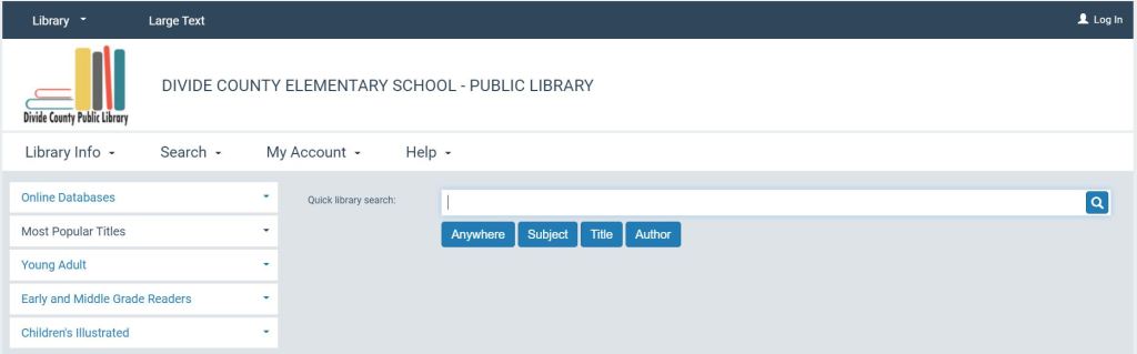 –LIBBY!! Our online e-materials website is available 24-7. All you need is Divide County Public Library and a password. Stop in and see us today!